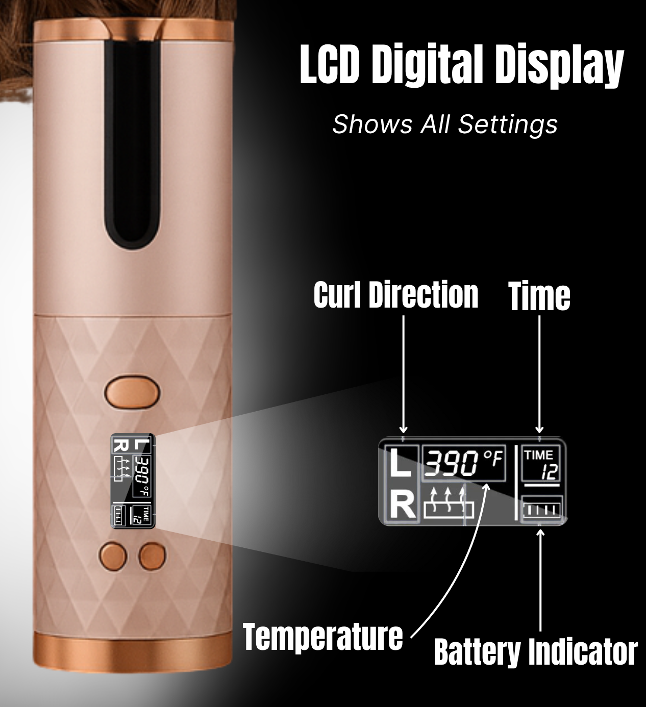 • Wireless portable, Anti scalding, Automatic curling